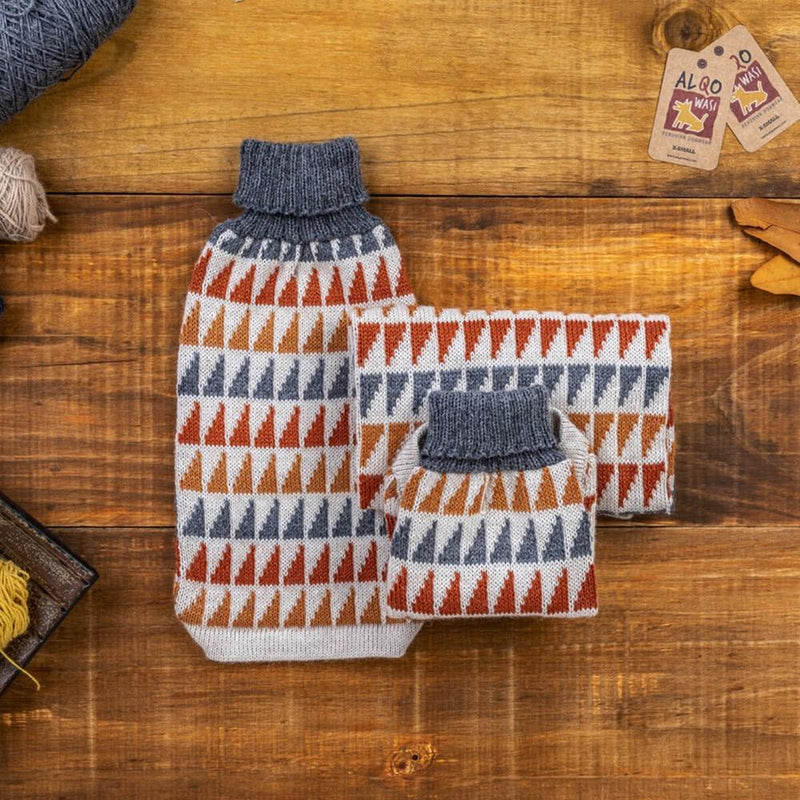 The Dog Mum Bundle brings together three of our most-loved pieces — the Italian Leather Heart Collar in deep red, the Triangle Alpaca Jumper in your choice of size, and the Baby Doll Rope Toy — all for £49.99.